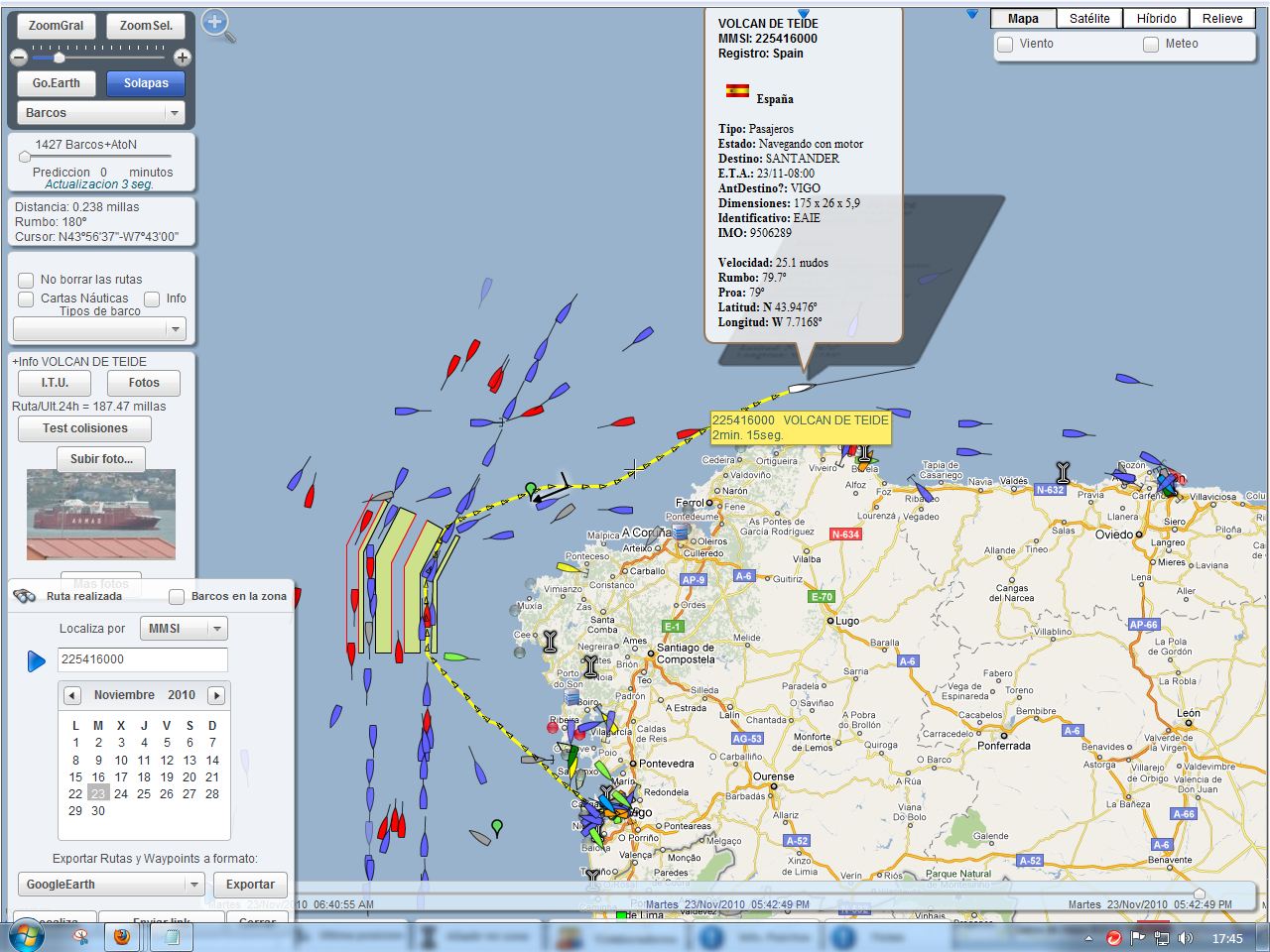 Às 1900h das Canárias navega com rumo Este a muito boa marcha -25 nós- à altura de Taipa de Casariego (no limite da Galícia com Astúrias).
