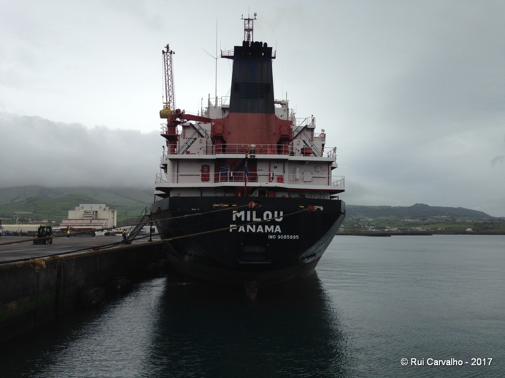 O quinto graneleiro do ano 2017 a escalar o porto da Praia da Vitória é o N/M "MILOU", que vindo de Ponta Delgada se estreia descarregando 2.125 toneladas de bagaço de soja para os recebedores UNICOL e TERCEIRENSE RAÇÕES, em partes iguais. A chuva copiosa que hoje se espera nos Açores irá prolongar ainda mais a estadia desde navio, pelo menos até 2ª feira, que depois de três dias fundeado a norte de São Miguel esperava uma janela de bom tempo para terminar a sua descarga nos dois portos.
