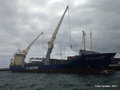 Mais um pequeno graneleiro carregado de palmiste e sêmea de trigo com origem africana a descarregar no porto da Praia da Vitória. O N/M "HC NADJA-MARIA" manifesta 4.040 toneladas de carga para os recebedores UNICOL e TERCEIRENSE RAÇÕES em partes iguais e com o mesmo destino final, rações para bovinos, principalmente.
